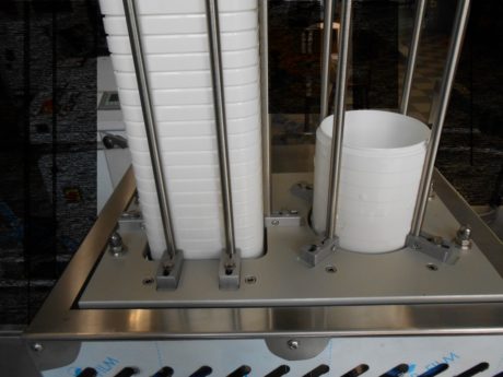 Automatischer Entstapler für Eimer mit oder ohne Henkel, zur automatischen Versorgung von Förderbändern oder Verpackungsmaschinen mit Eimern.